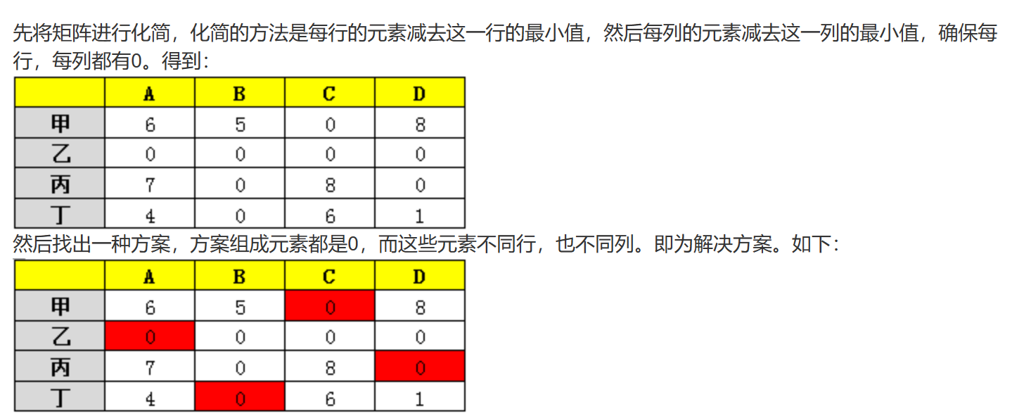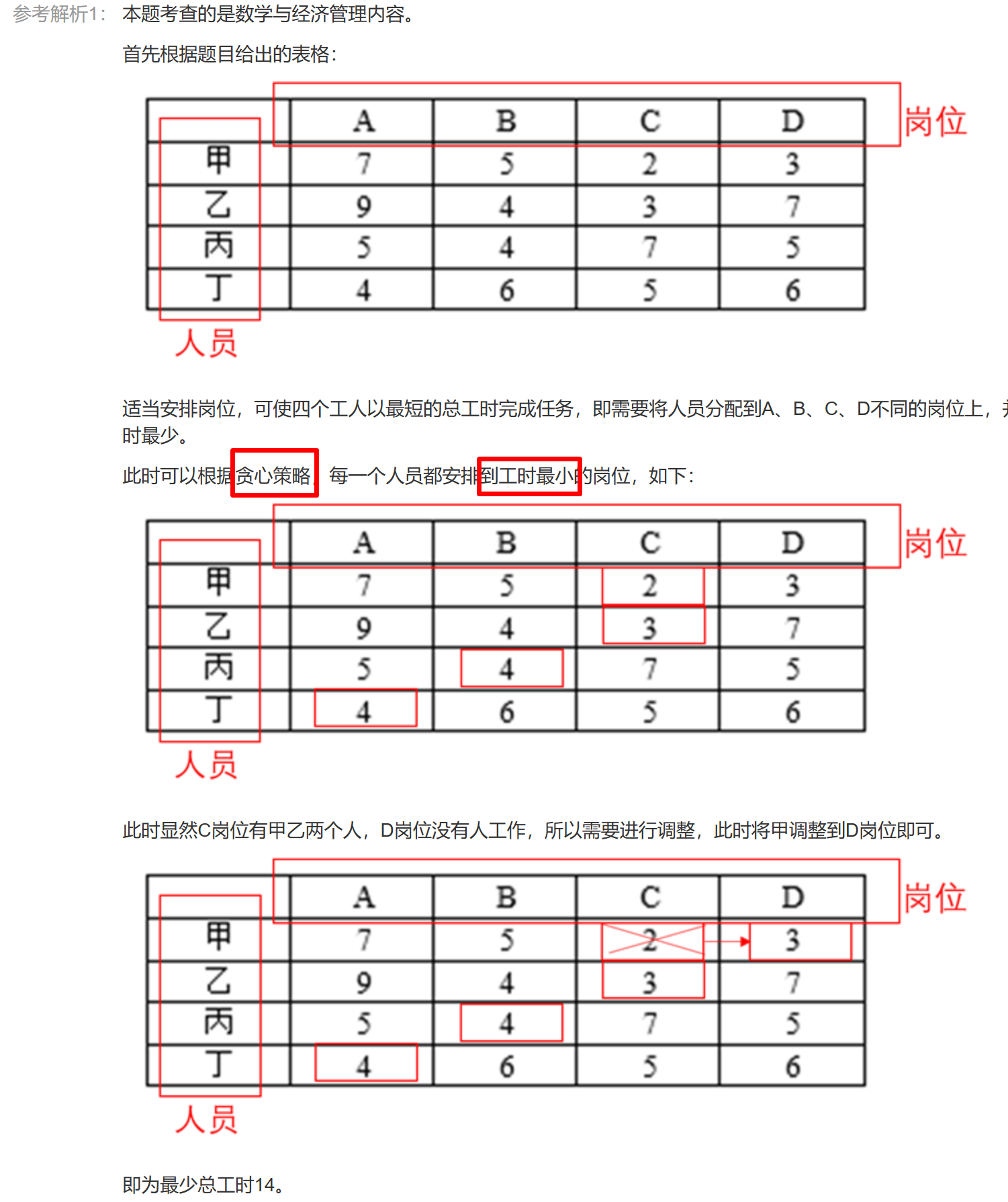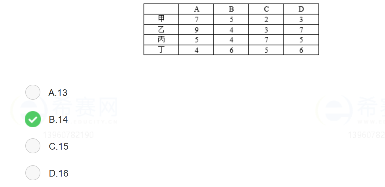 某企业准备将四个工人甲、乙、丙、丁分配在A、B、C、D四个岗位。每个工人由于技术水平不同,在不同岗位上每天完成任务所需的工时见下表。适当安排岗位,可使四个工人以最短的总工时( 14 )全部完成每天的任务。