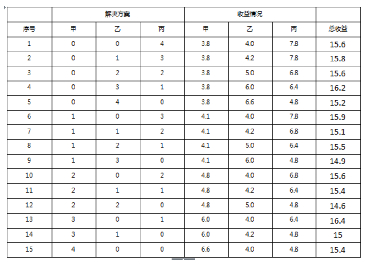 此时,y=13,即甲乙丙丁四组分别用0、0、13、15天做上衣,用15、15、2、0天做裤子。