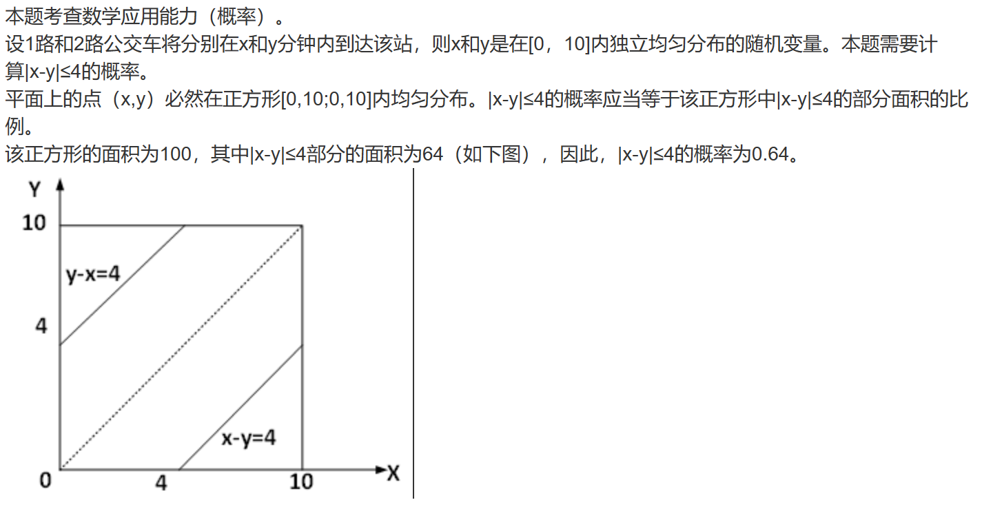1路和2路公交车都将在10分钟内均匀随机地到达同一车站,则它们相隔4分钟内到达该站的概率为( 0.64 )。