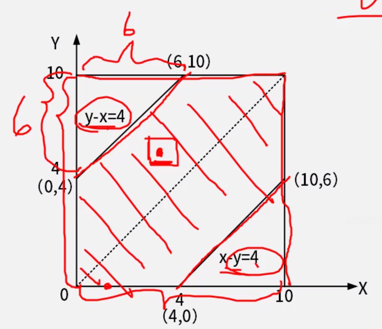 右下角部分面积是(10-4)*6/2=18